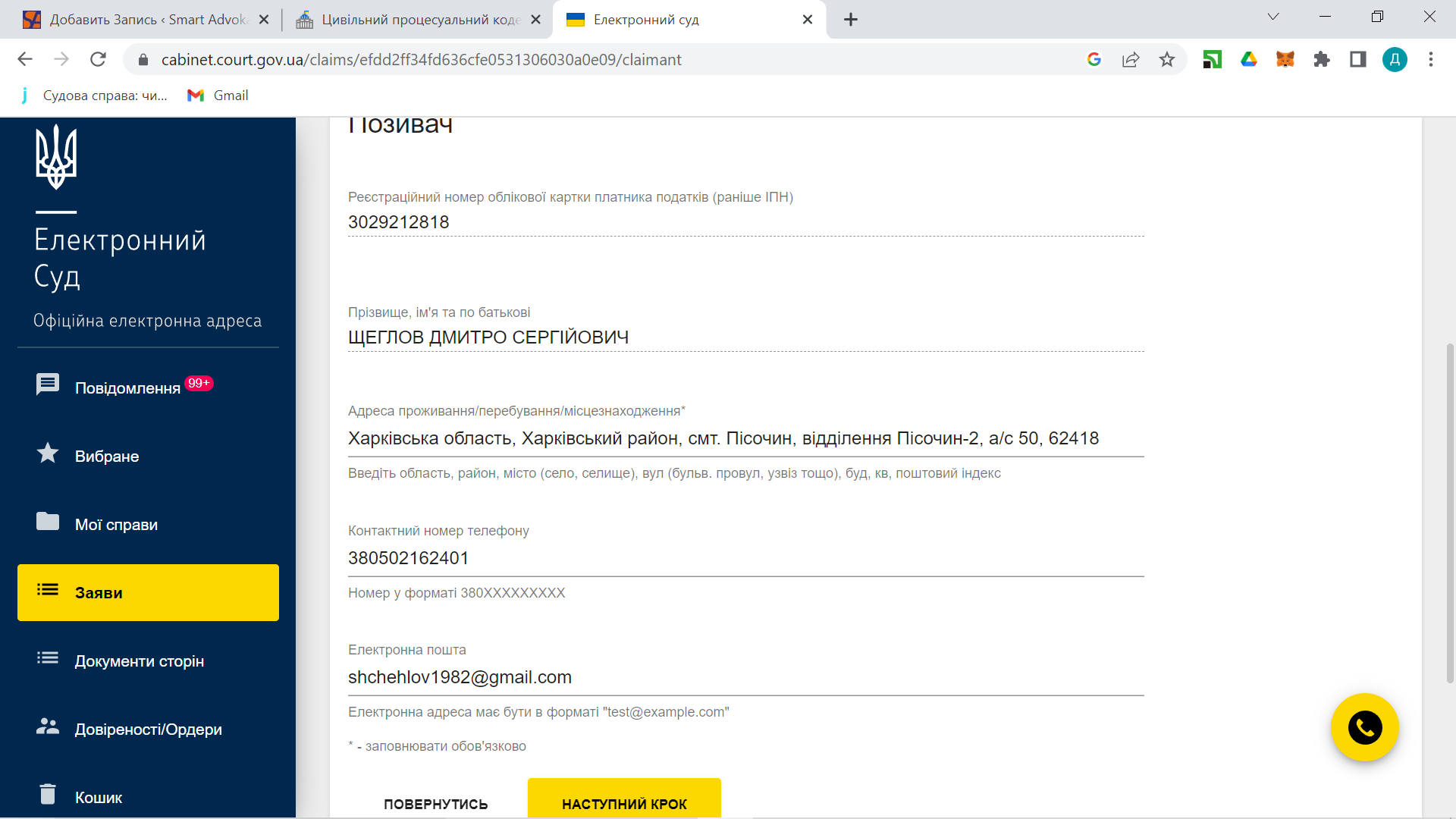 Заповнюємо данні відповідача: ФІО, адреса зареєстрованого місця проживання — обов’язково; РНОКПП, номер телефону, Email — якщо відомі. Натискаємо Наступний крок.