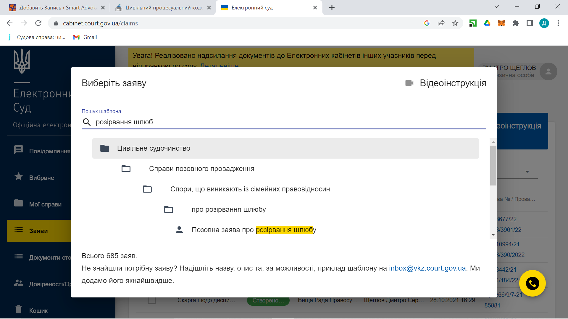 В пошуку вводимо “розірвання шлюбу”, обираєм із переліку “Позовна заява про розірвання шлюбу”.