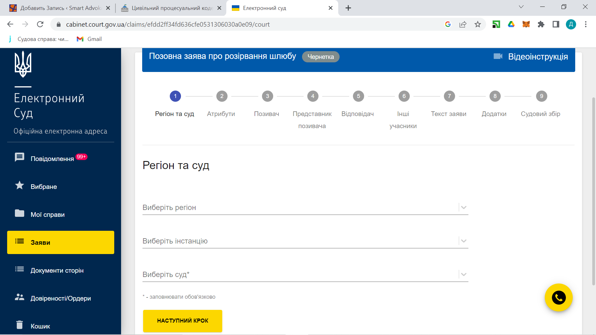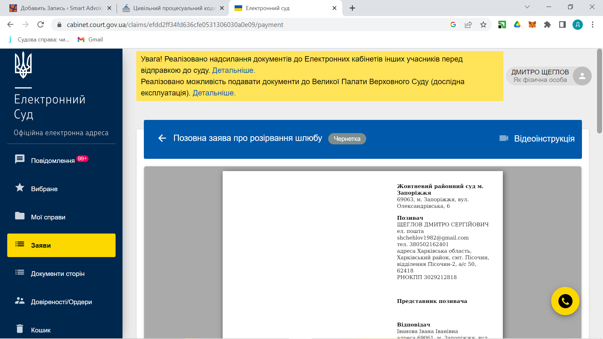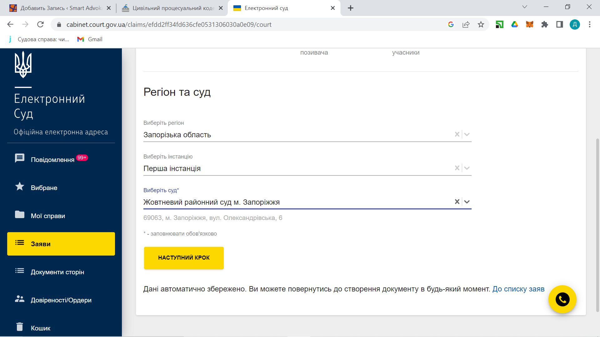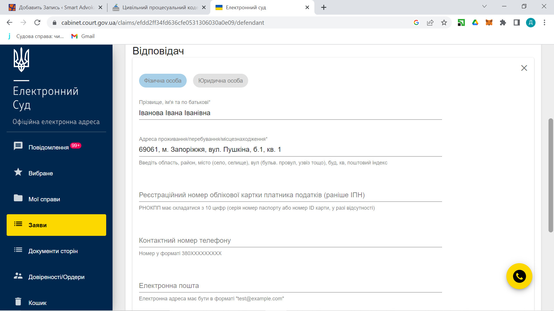 Заповнюємо данні відповідача: ФІО, адреса зареєстрованого місця проживання – обов’язково; РНОКПП, номер телефону, Email – якщо відомі. Натискаємо Наступний крок.