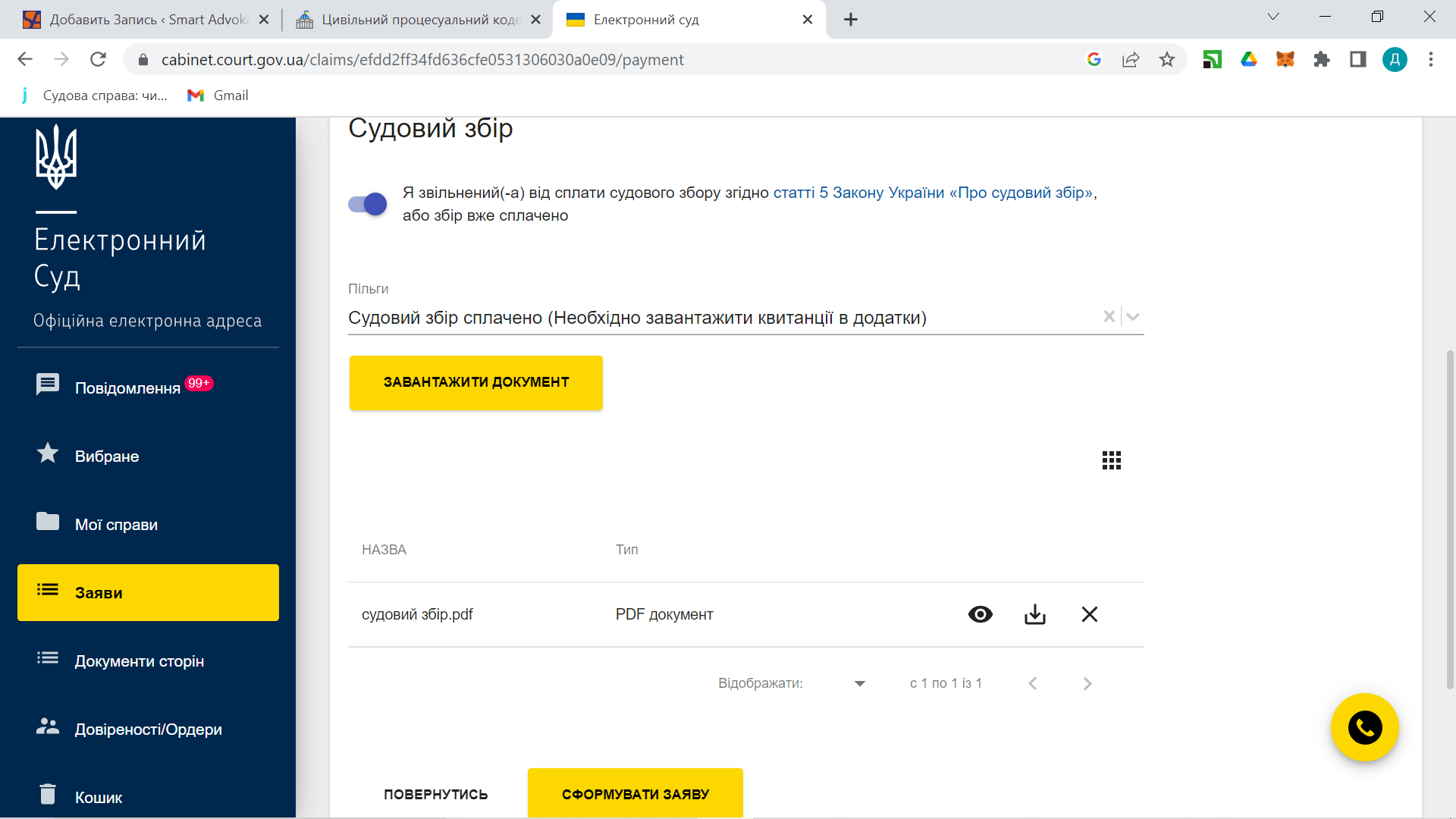Якщо сплатили судовий збір через сторонній сервіс і маєте квитанцію: натискаємо прапорець “Я звільнений від сплати судового збору”; обираєте “судовий збір сплачено”; завантажуєте квитанцію; натискаєте Сформувати заяву.
