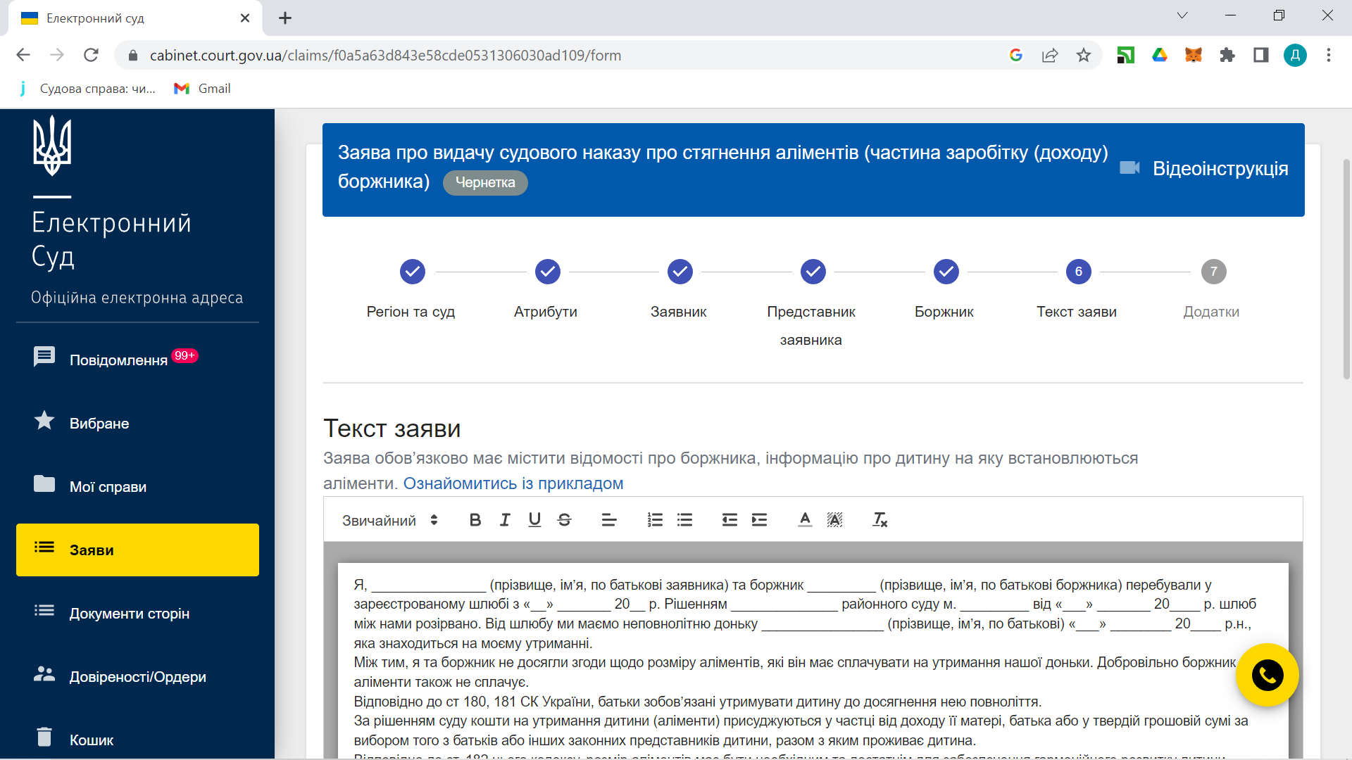 Завантажте додатки. Рекомендовано додати: копія свідоцтва про народження дитини, рішення суду про розірвання шлюбу, або копія свідоцтва про одруження (за наявності), копія паспорта та РНОКПП заявника, копія паспорта та РНОКПП боржника (за наявності), копія довідки про склад сім’ї, докази надіслання заяви с додатками боржнику (квитанція про оплату відправлення та опис вкладення до листа). Насьогодні це досить легко зробити через онлайн сервіс https://e-post.com.ua/