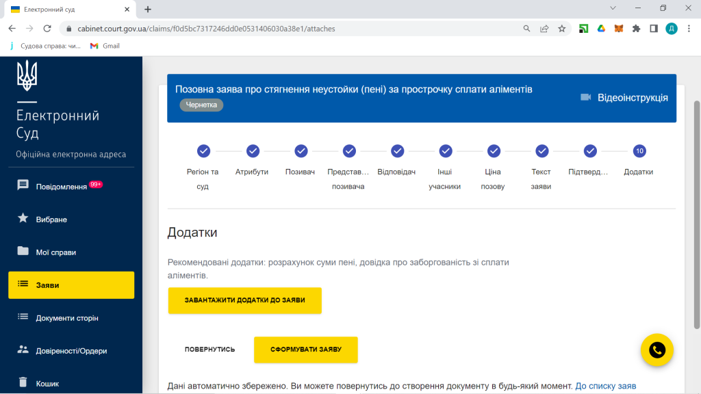 Підписуєте заяву та вона автоматично відправляється до суду. Чекаєте на відкриття провадження по справі.